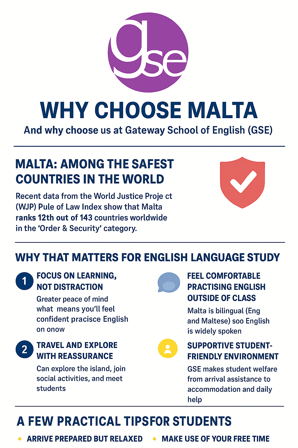 In summary: If you’re looking for a place to study English where your personal safety is taken seriously, where you can concentrate on learning, integrate into English-speaking everyday life and enjoy a welcoming student environment, then Malta — and GSE in particular — should be at the top of your list. With Malta recently ranked 12th globally for safety in “Order & Security”, you’re choosing a destination where you can flourish. We look forward to welcoming you at Gateway School of English and helping you achieve your English-language goals in a secure, vibrant and motivating setting.