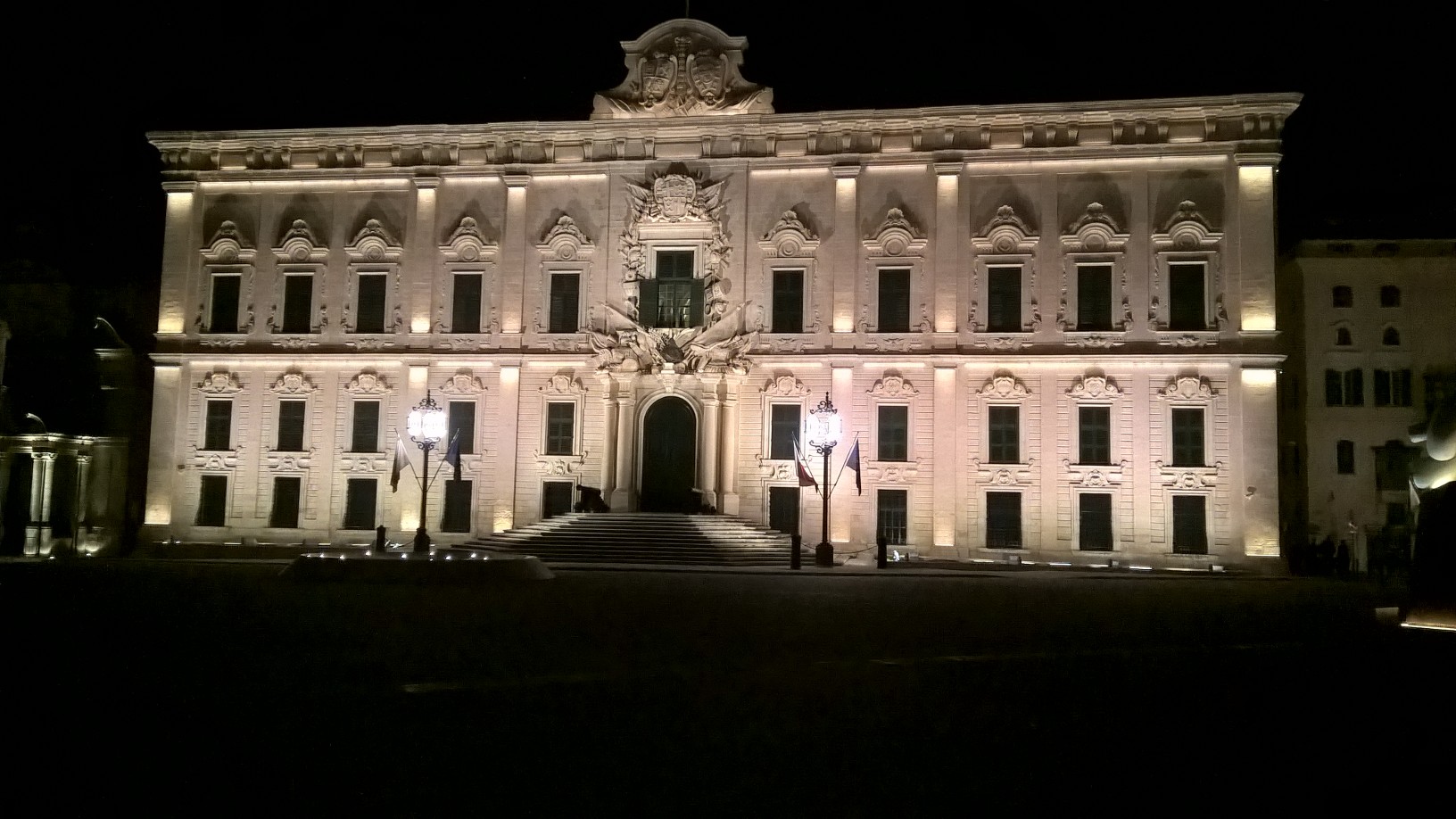 The beautiful Auberge de Castille in Castille Square Valletta lit up at night: